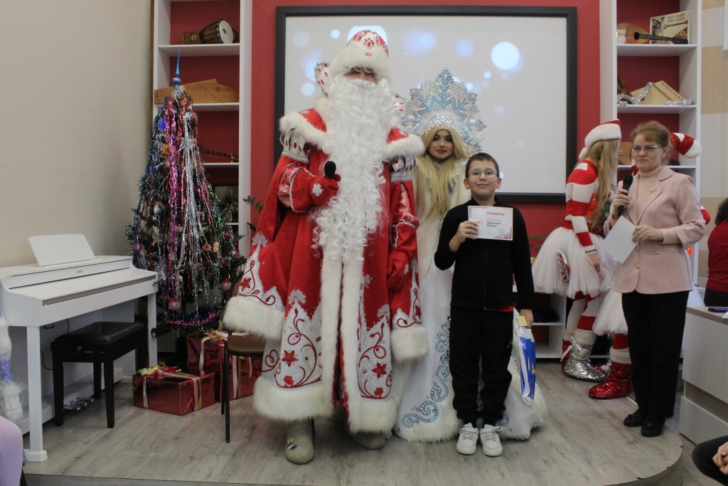 Поздравить читающих детей прибыли Дед Мороз и Снегурочка. Новогодние волшебники поздравили детей и родителей с наступающим Новым Годом и провели с ними весёлую развлекательную программу. Дети отгадывали музыкальные загадки, рассказывали стихотворения, выполняли различные задания, пели и танцевали.